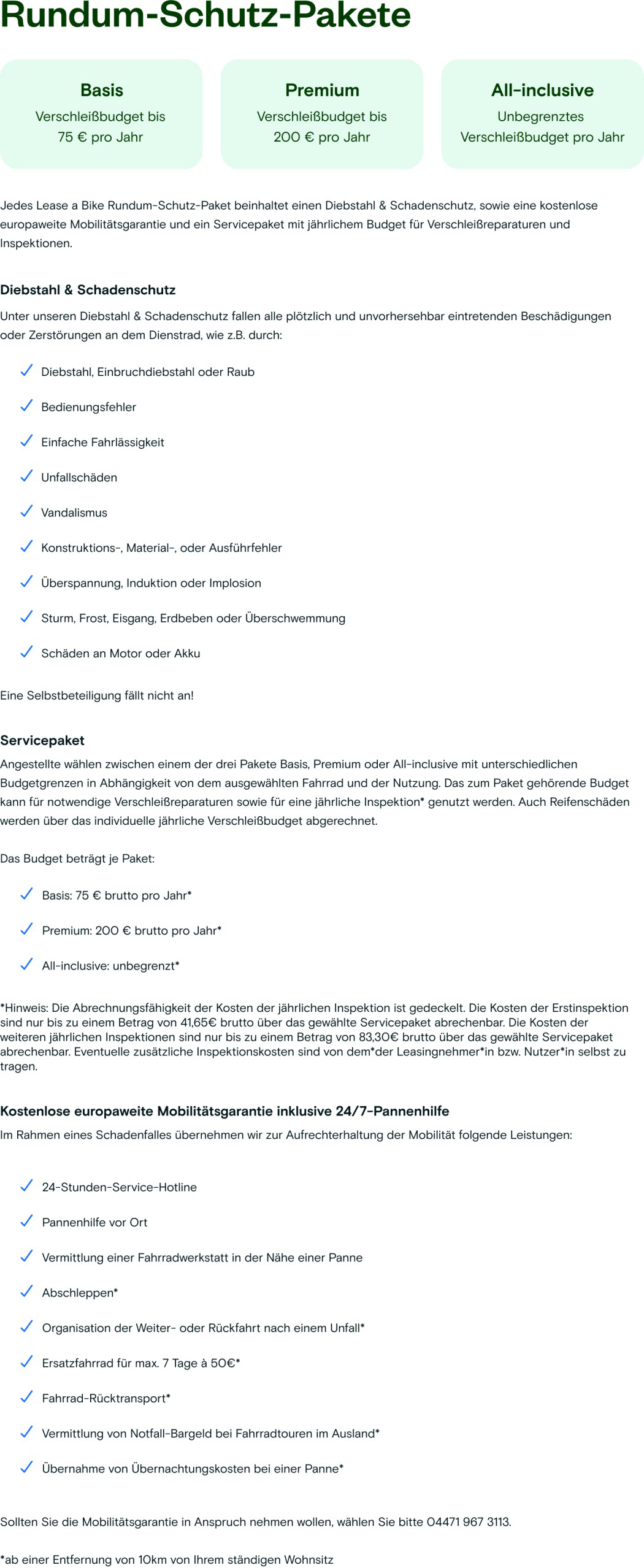 Angestellte erhalten als Rundum-Schutz-Paket das All-inclusive-Paket, welches über ein unbegrenztes Budget verfügt. Hierüber werden Reparaturen, die zur Betriebssicherheit des Fahrrades notwendig sind, abgerechnet. Auch Reifenschäden, da diese kein Schadenfall im Sinne eines versicherungstechnischen Schadens sind, werden über das individuelle jährliche Verschleißbudget abgerechnet.